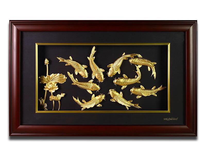 Bức Tranh Hoa Sen Cá Chép Bằng Vàng mang giá trị phong thủy cao. Giúp đem đến sự an lành, sung túc, thịnh vượng trong cuộc sống, sức khỏe như ý, may mắn về tài lộc kinh doanh và thành công trong học hành thi cử.