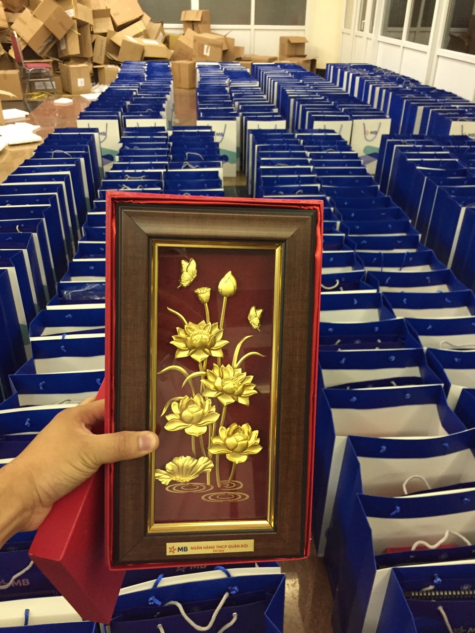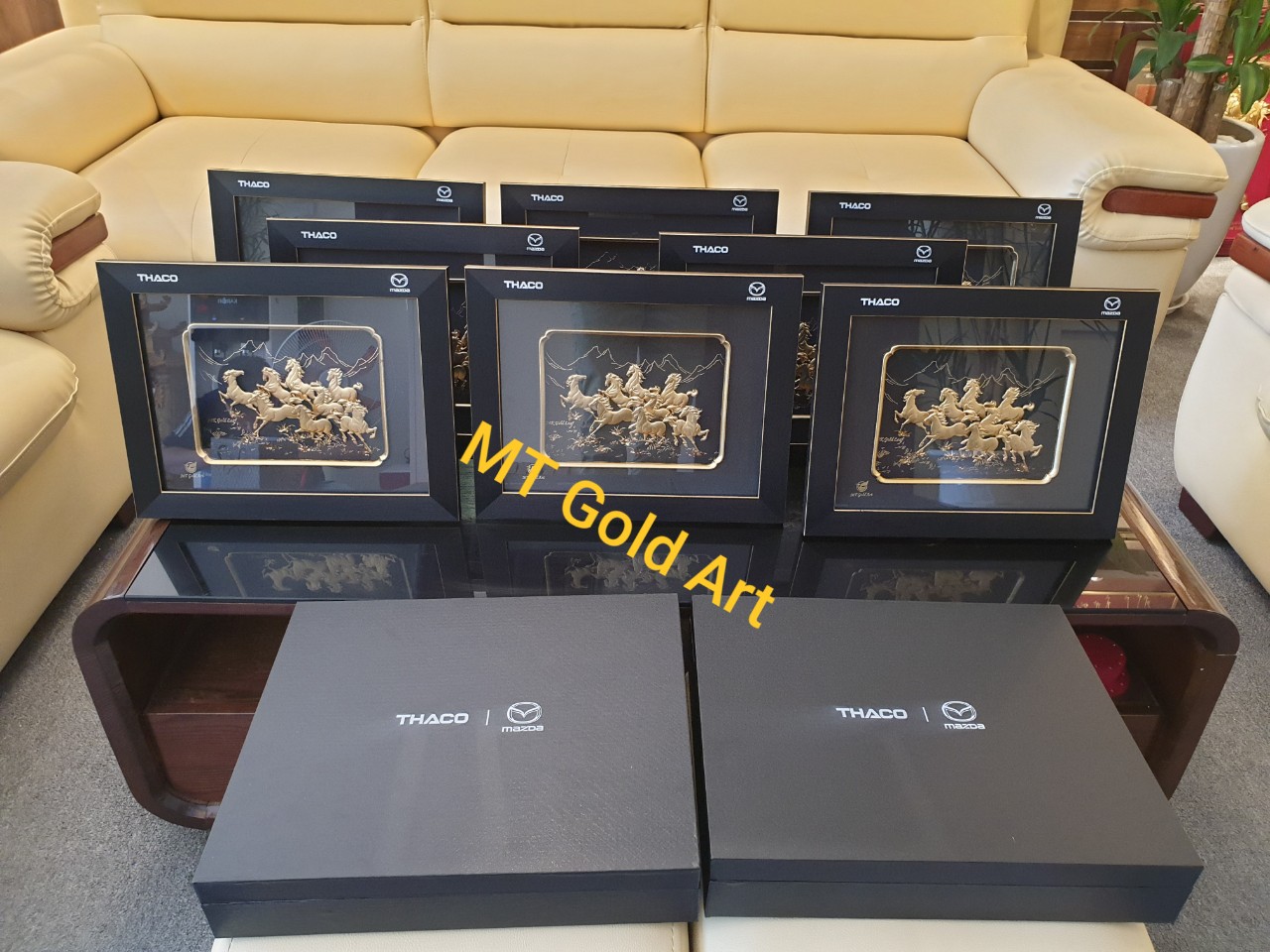 Hiện tại , QUÀ TẶNG VÀNG có sẵn hàng trăm mẫu quà tặng dành cho doanh nghiệp đặt với số lượng lớn . Ngoài các mẫu tranh dát vàng 24K nhiều kích cỡ , chúng tôi còn có những mẫu biểu trưng – tượng dát vàng , các bộ ly uống rượu ,uống trà chứa vàng cao cấp.