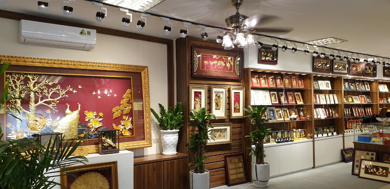 Tại đây có rất nhiều các mẫu sản phẩm cao cấp chuyên quà tặng . Các mẫu tranh dát vàng nhiều kích thước khác nhau , các mẫu bộ ly uống rượu vang phale chứa vàng . Các bộ ly uống rượu ta các mẫu biểu trưng linh vật 12 con giáp dát vàng . Các mẫu chậu hoa – chậu cây bonsai dát vàng vô cùng sang trọng …